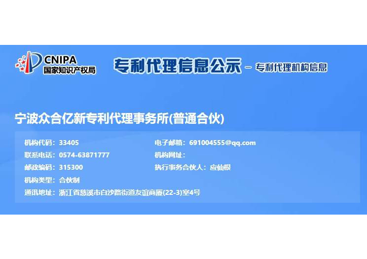 浙江億新知識(shí)產(chǎn)權(quán)服務(wù)有限公司前身為慈溪眾合知識(shí)產(chǎn)權(quán)代理事務(wù)所,創(chuàng)始于2004年,為了服務(wù)更多的創(chuàng)新企業(yè),實(shí)現(xiàn)“服務(wù)億萬創(chuàng)新企業(yè)”的理念,后更名為浙江億新知識(shí)產(chǎn)權(quán),旗下公司包括:寧波眾合億新專利代理事務(wù)所(機(jī)構(gòu)代碼33405)、中范(北京)認(rèn)證有限公司。其中寧波眾合億新專利代理事務(wù)所是慈溪市科技服務(wù)聯(lián)盟理事單位,前灣區(qū)知識(shí)產(chǎn)權(quán)工作站。公司位于浙江省慈溪市文化商務(wù)區(qū)友誼商廈,并在北京、青島設(shè)有辦事處。